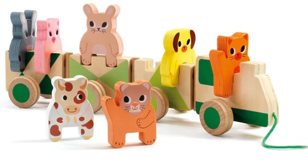 •A cute and colorful wooden train with farm animal passengers. Children can enjoy putting the seven animals on the four carriages and pulling them using the cord. When not on the train, the animals stand upright and children can make up games to play with them!