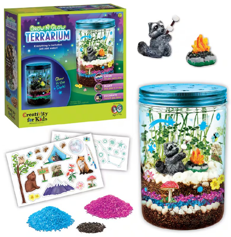 •Creativity for Kids Grow N’ Glow Terrarium is fun for both boys and girls – all year long! Kids will experience the accomplishment of growing their own little habitat. The Grow N’ Glow Terrarium is the perfect STEAM (Science, Technology, Engineering, ART, Math) experience.