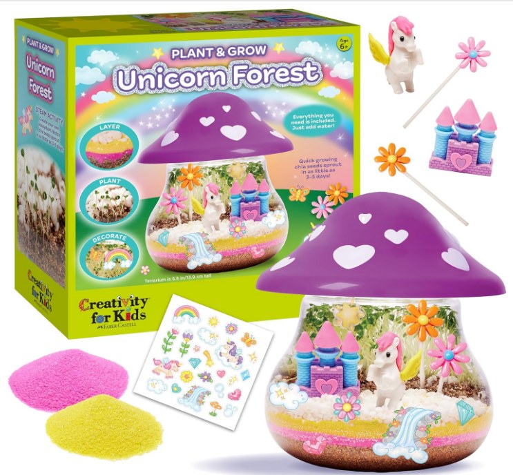 •UNICORN CRAFT: Give the gift of creativity with the hands-on STEM kits for kids ages 6-7+! •Everything you need to grow your own unicorn forest is included; just add water. The complete terrarium kit includes a mushroom-shaped terrarium, 2 unicorn figures, potting mix, white stones, stickers, colorful sand for layering, mini-flowers?, and more!
